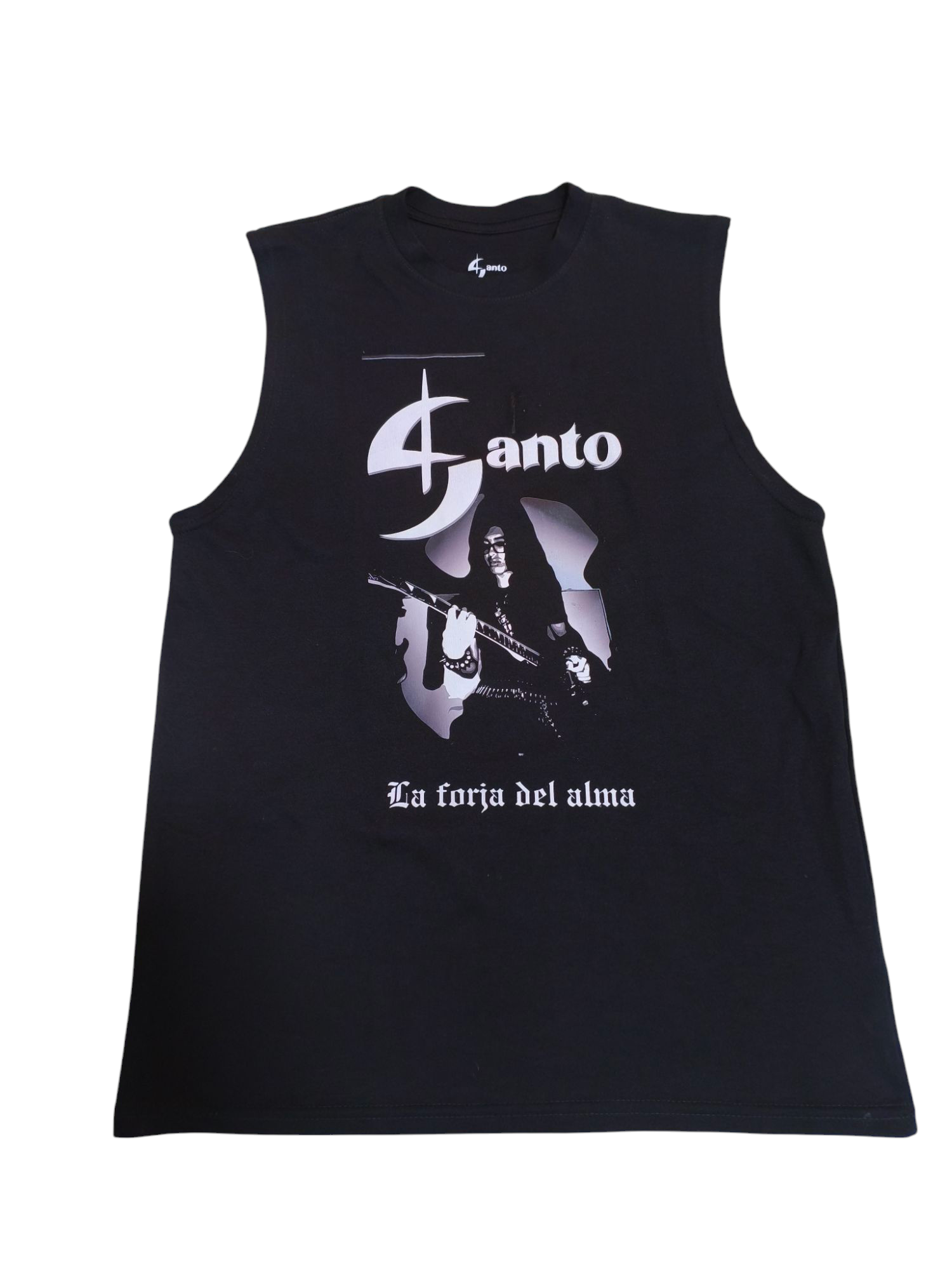 Este tank top sin mangas fusiona el arte oscuro con la determinación del guerrero moderno. Diseño exclusivo de SantoGTR28, con el icónico lema “La forja del alma” impreso al frente y una imagen que representa el poder de transformar el dolor en expresión.